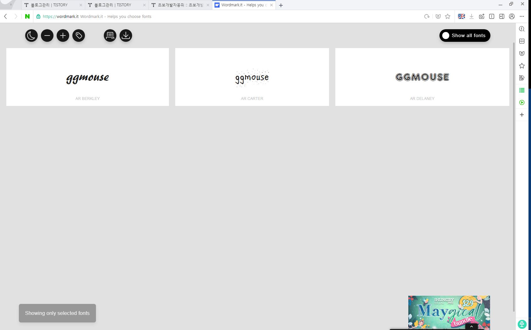 폰트들을 선택 후 오른쪽 상단의 Filter selected 버튼을 누르면 선택한 폰트들만 모아서 보여집니다.