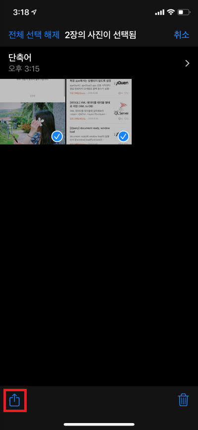 3. 사진앱으로 이동하여 합치고 싶은 사진을 선택한 후 공유버튼을 클릭한다.