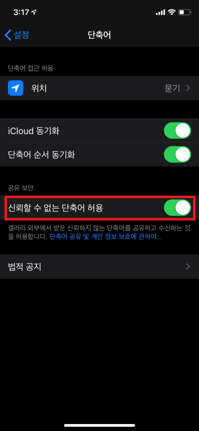 1. 설정 -> 단축어에서 신뢰할 수 없는 단축어 허용이 체크되어 있는지 확인한다.