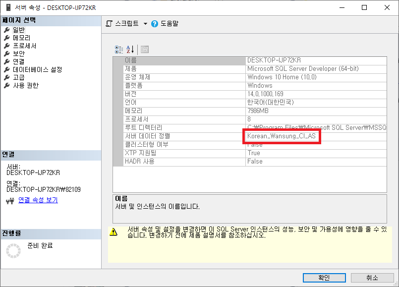 혹은 SSMS에서 데이터베이스 우클릭 -> 속성에서도 확인할 수 있다.