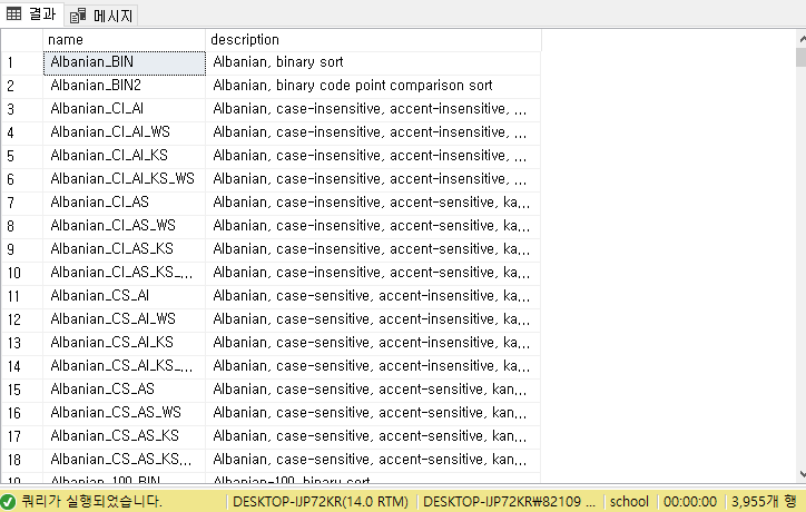 sys.fn_helpcollations를 통해 지원하는 collation 리스트를 볼 수 있다.