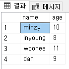 EXEC usp_student_ins @s_name = 'minzy', @s_age = 10 EXEC usp_student_ins @s_name = 'inyoung', @s_age = 8 EXEC usp_student_ins @s_name = 'woohee', @s_age = 11 EXEC usp_student_ins @s_name = 'dan', @s_age = 9 GO SELECT * FROM table_ggmouse