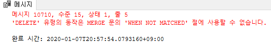 'DELETE' 유형의 동작은 MERGE 문의 'WHEN NOT MATCHED' 절에 사용할 수 없습니다.