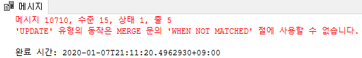 'UPDATE' 유형의 동작은 MERGE 문의 'WHEN NOT MATCHED' 절에 사용할 수 없습니다.