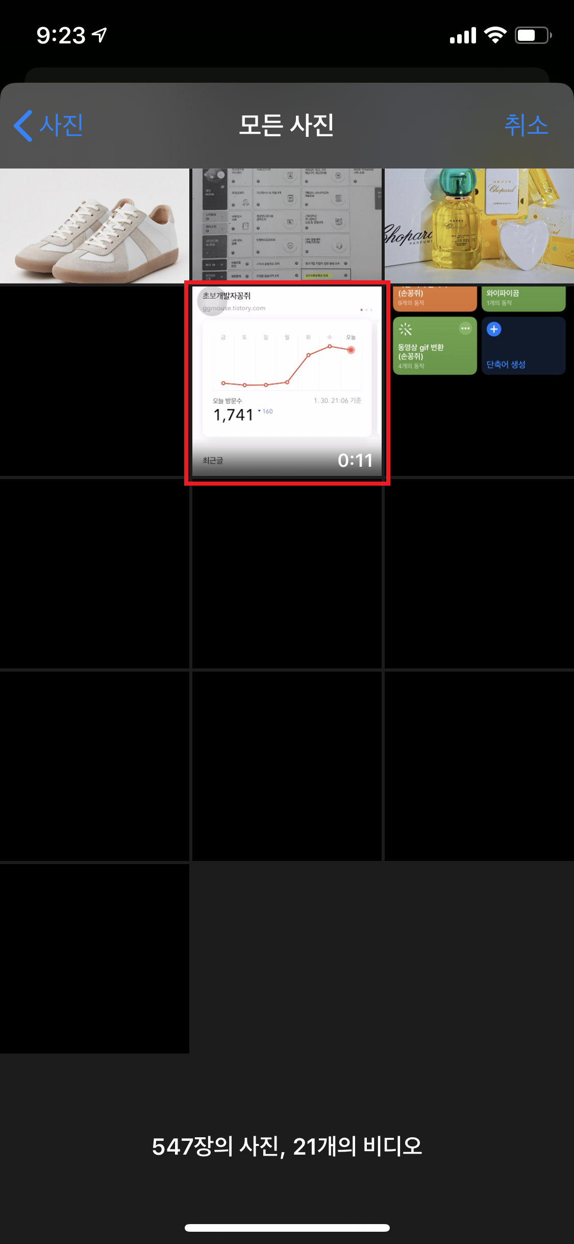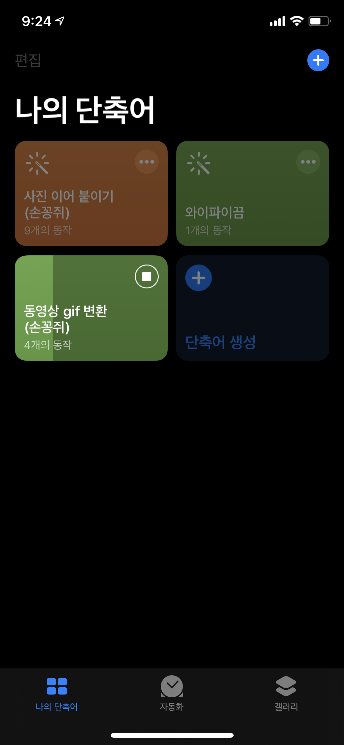 3. 단축키 앱에서 생성된 "동영상 gif 변환 (손꽁쥐)"를 실행하고, GIF로 변환할 동영상을 선택 후 완료