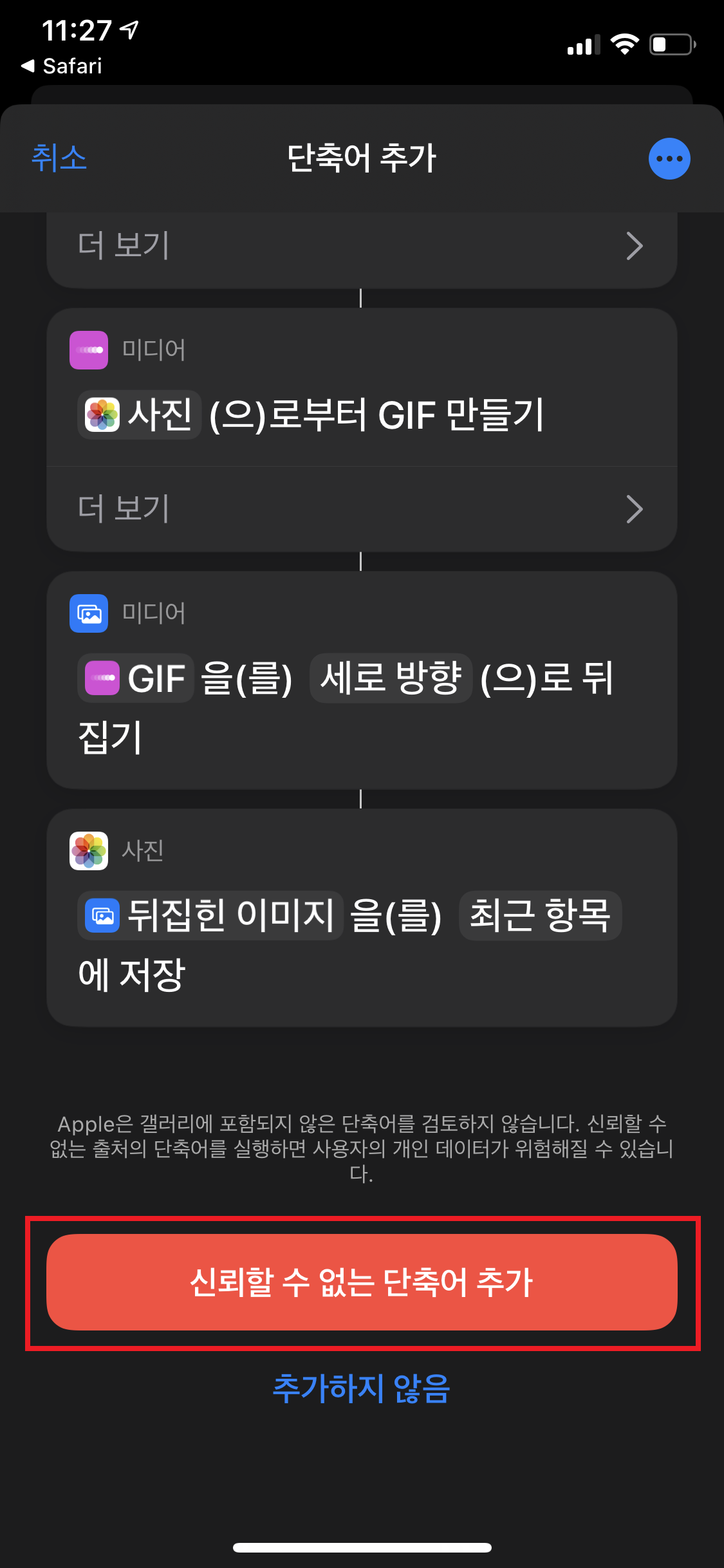 1. 설정 -> 단축어에서 신뢰할 수 없는 단축어 허용이 체크되어 있는지 확인한다.